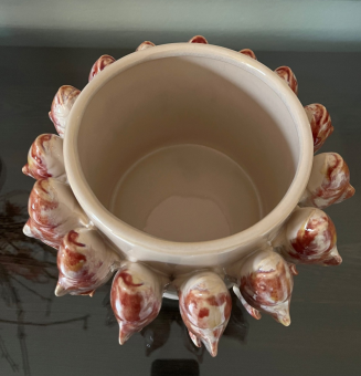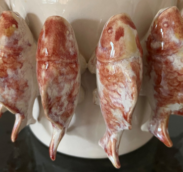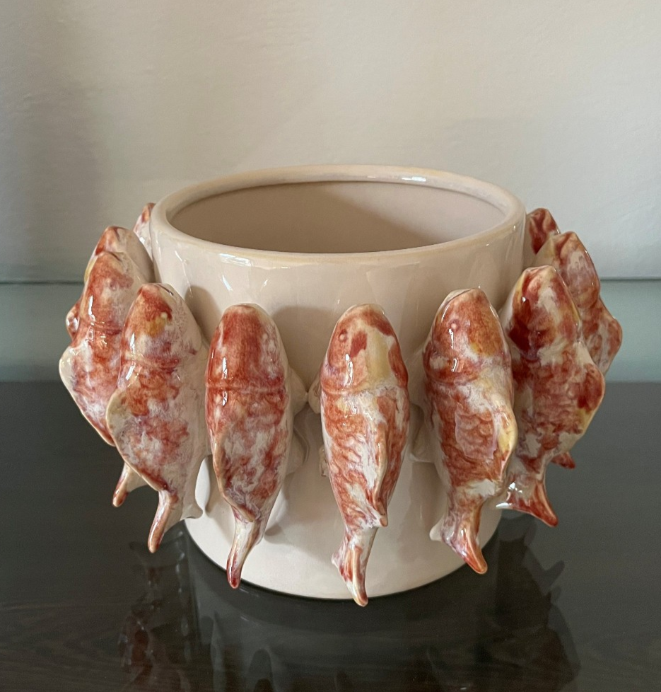 Runde Schale oder Übertopf mit rundum aufgesetzten Fischen.