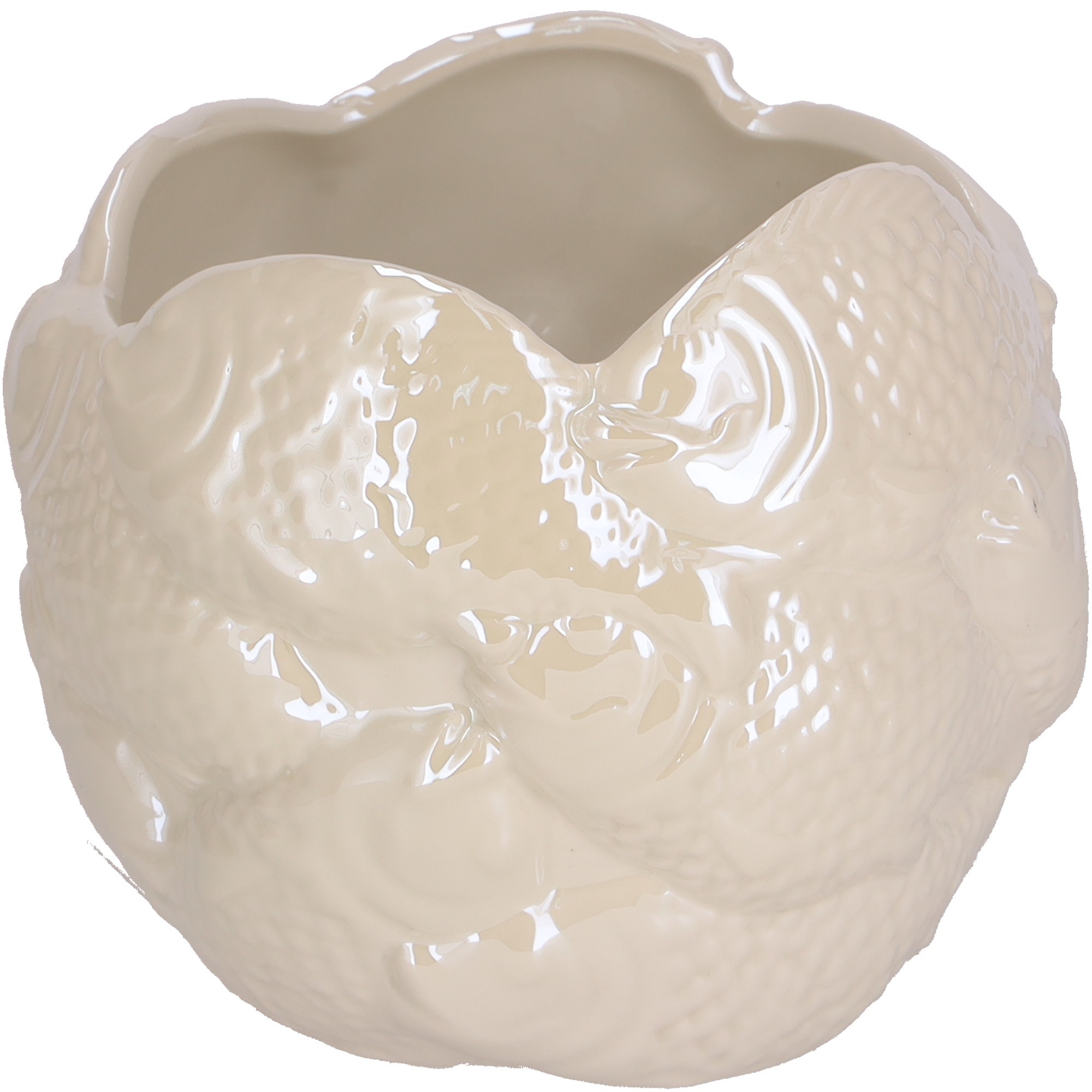 Tolle Kübel aus Keramik mit Fischrelief in creme weiß leicht irisierend schimmernd.Maße ca: Durchmesser 13 cm, Höhe 11 cm.