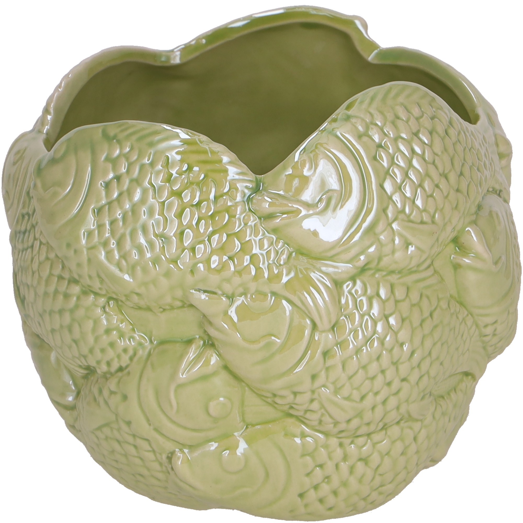 Tolle Kübel aus Keramik mit Fischrelief in grün leicht irisierend schimmernd.Maße ca: Durchmesser 13 cm, Höhe 11 cm.
