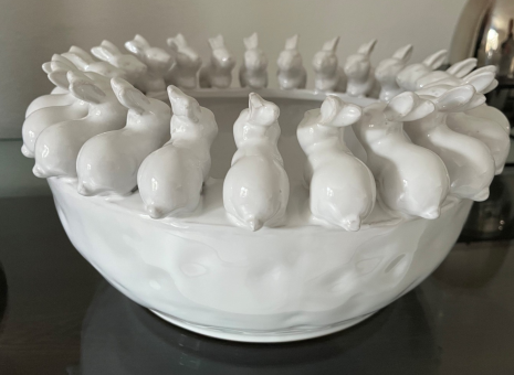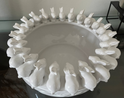 Es handelt sich hier um ein Produkt in Handarbeit, die Häschen werden einzeln auf die Schale aufgesetzt.