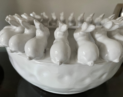 Runde Schale mit aufgesetzten Häschen mit unregelmäßig weißer Glanzglasur.