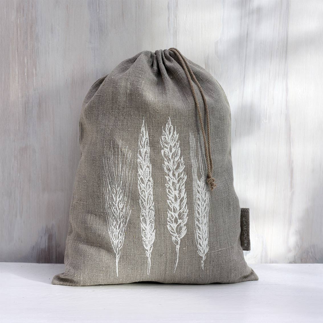 Das Ährenmotiv wird in unserer Manufaktur per Hand auf das vorgewaschene Naturleinen des Brotbeutels gedruckt.