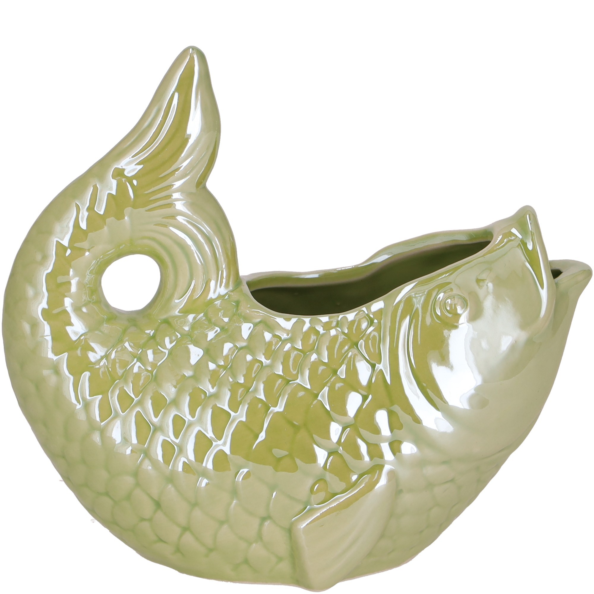 Tolle flache Vase aus Keramik mit Fischrelief in grün leicht irisierend schimmernd.Maße ca: Durchmesser 15,5 cm.